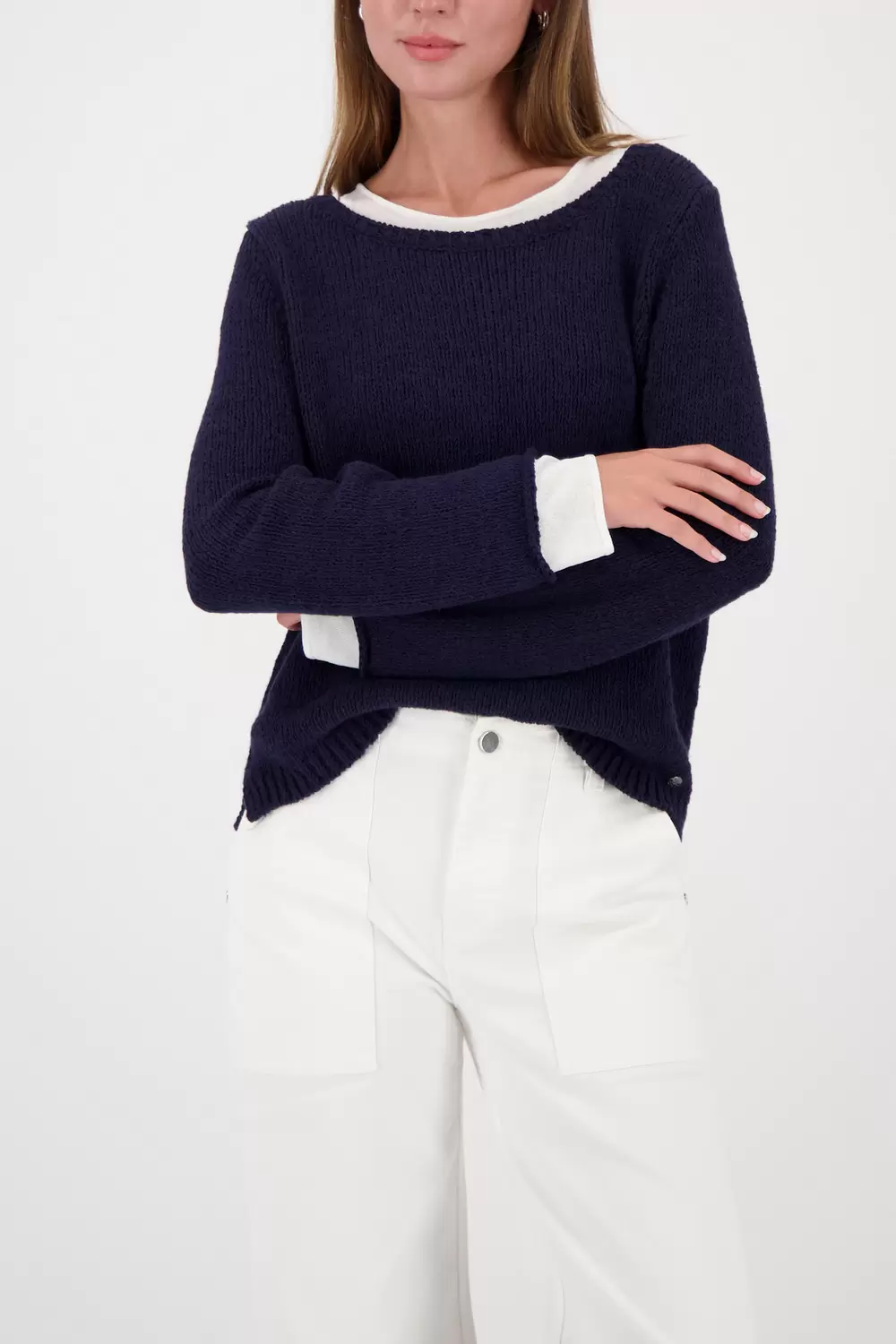 Entdecken Sie diesen stilvollen 2-in-1 Strickpullover aus einer hochwertigen Baumwolle mit seitlichen Schlitzen und zeitlosem Design.